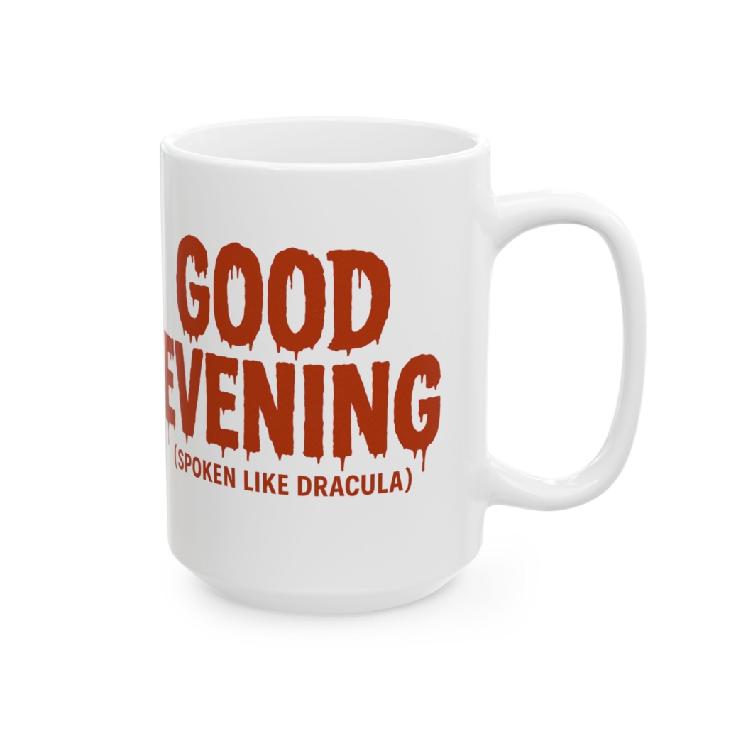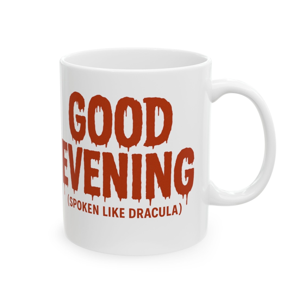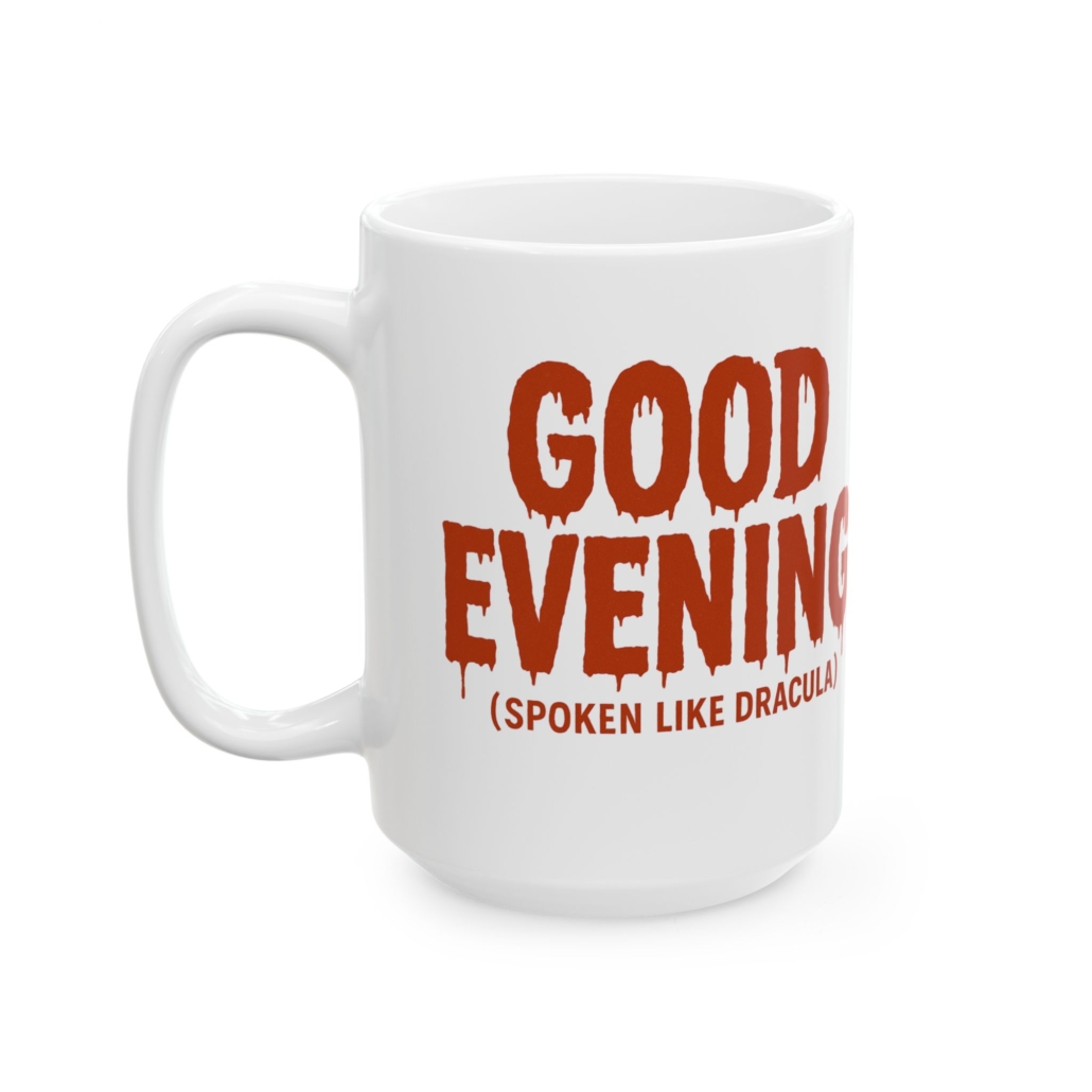 A Good Evening (spoken like Dracula) coffee mug, perfect for vampire enthusiasts or Halloween lovers. This spooky mug gives off a mysterious and fun vibe, ideal for sipping your favorite beverages in the evening. Great for Halloween parties, horror movie marathons, or as a unique gift for fans of the supernatural.