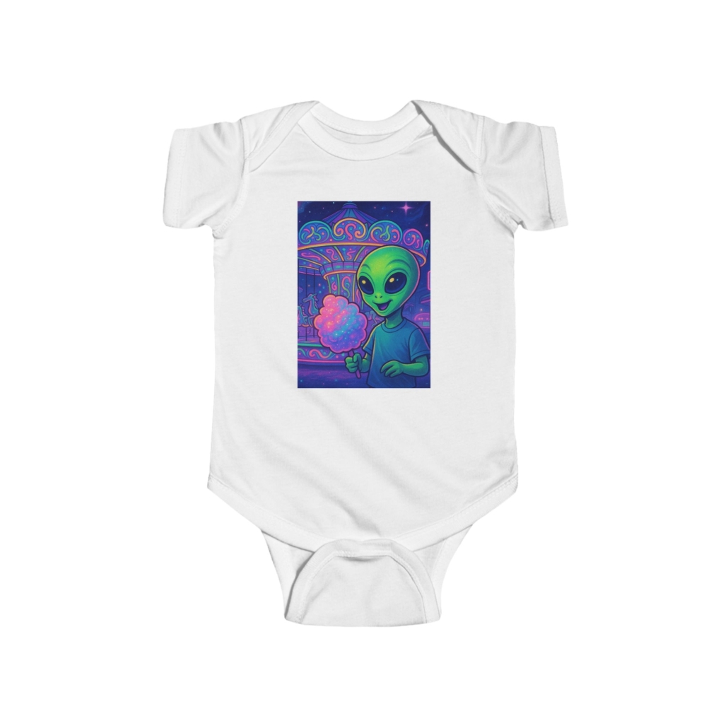 Introducing the perfect mix of comfort and style for your little one: this Infant Fine Jersey Bodysuit is a must-have for any trendy baby wardrobe. With its delightful design featuring a playful alien character, it brings a sense of fun and whimsy to everyday outfits. Soft and smooth, the fabric ensures your baby stays cozy while enjoying every adventure.