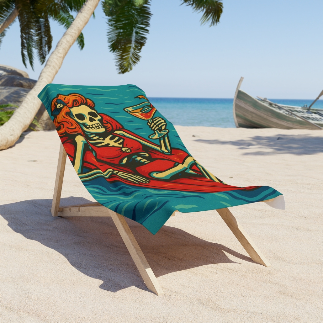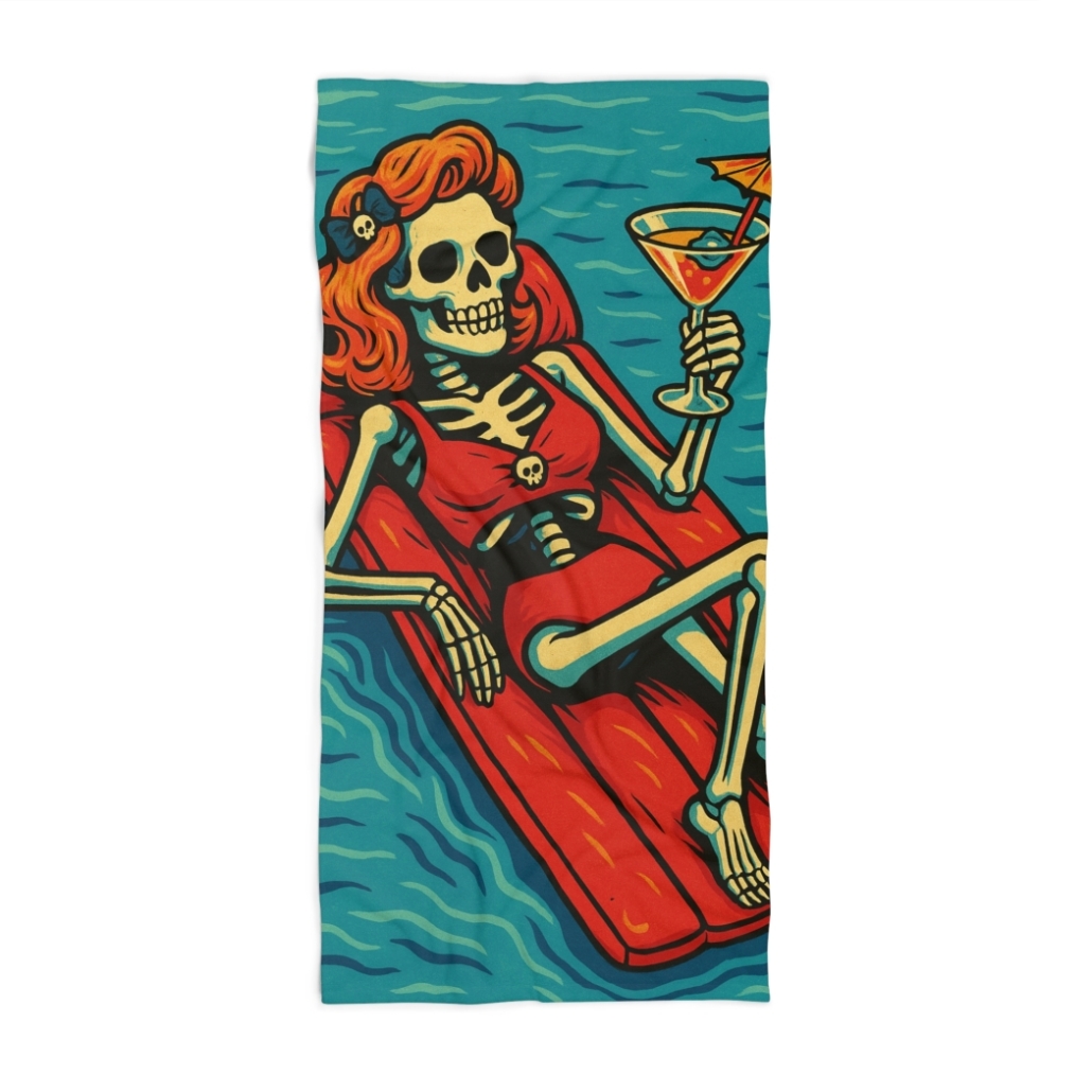 Made for sun lovers and fun-seekers, this towel provides a perfect blend of comfort and style. Its playful design features a spirited skeleton enjoying a cocktail, making it an eye-catching accessory for your next beach day or pool party.