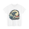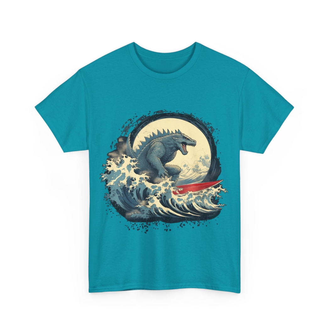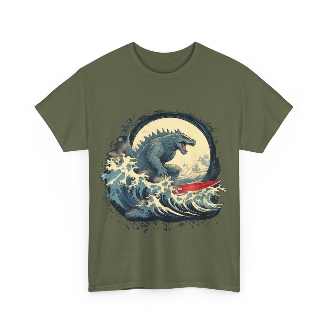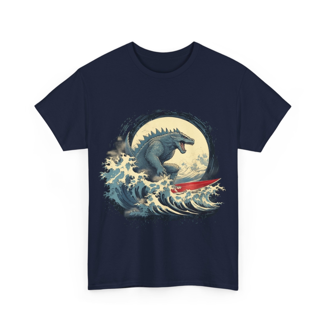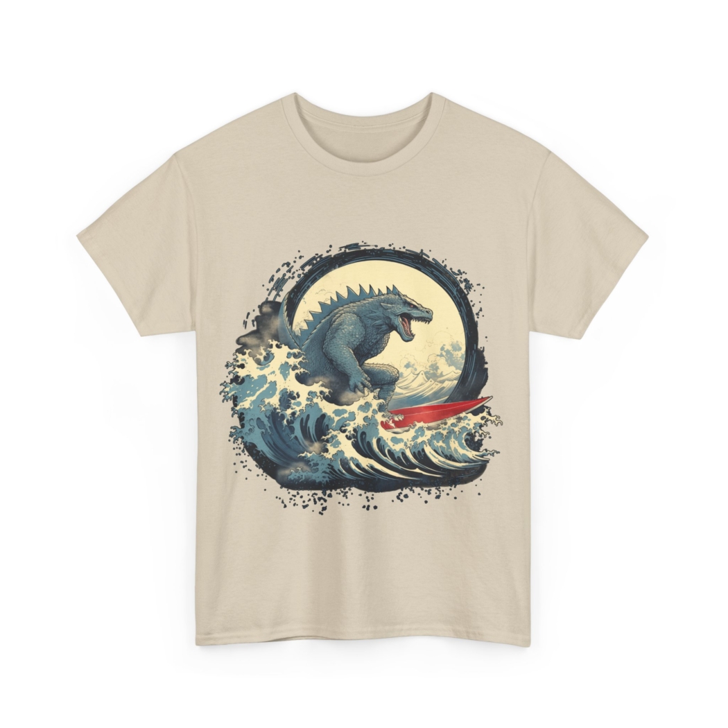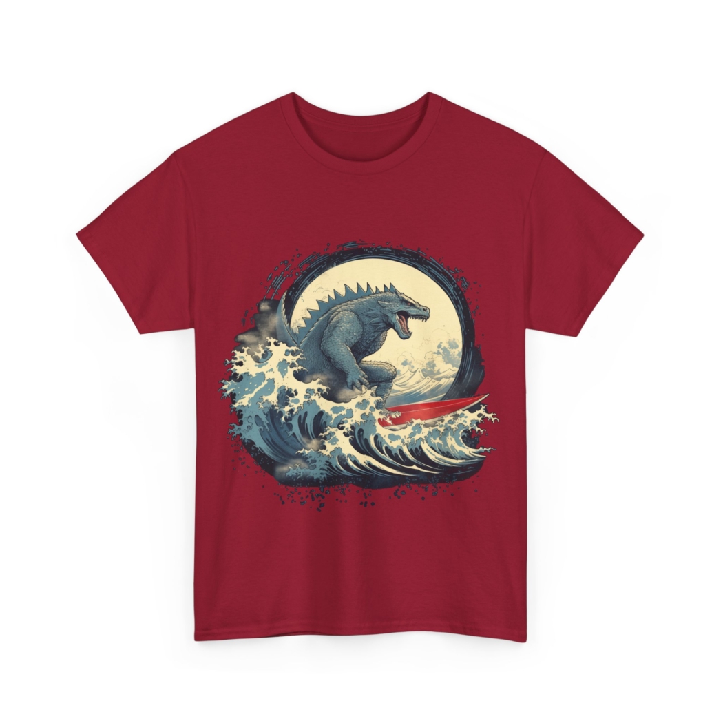 A unique image of a large lizard surfing the waves of Kanagawa on a comfortable, unisex garment-dyed T-shirt. Perfect for fans of Godzilla and Japanese art, this T-shirt is ideal for casual wear or as a statement piece. It’s a great gift for birthdays, Christmas, or any special occasion.